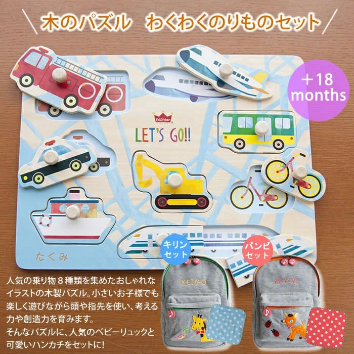 名前入り のりものパズルとリュックとハンカチのセット おうち時間