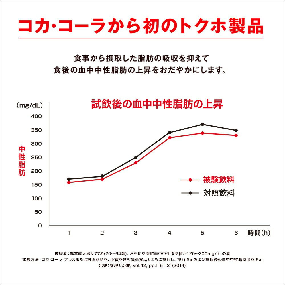 「コカ・コーラ プラス」は、日本のお客さまのために開発された新製品で、食事から摂取した脂肪の吸収を抑え、食後の血中中性脂肪の上昇をおだやかにする関与成分(特定の保健の目的に資する栄養成分)の難消化性デキストリン(食物繊維)を配合した特定保健用食品です。